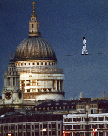 Two suitable warehouses were chosen – on the north bank in the City of London, Bull Wharf; on the south bank – Bear Wharf, Southwark. We calculated the stresses to be superimposed on both buildings and by a complicated series of pulley blocks and winches were able to safely distribute the strain throughout the structures. In 1997, we were called on to assist with another attempt, this time by a double-act, Didier Pasquette and Jade Kinder Martin. We anchored each end of the steel tightrope to two 120-ton cranes, then used winches to apply the final tension to the tightrope for their record-breaking event.