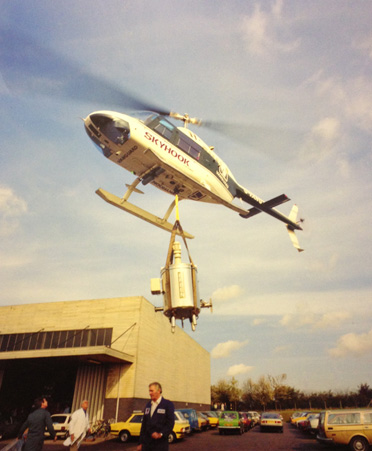 Vanguard always maintained a policy of embracing new technology and methods in their own industry and in 1982 formed Skyhook Lifting Limited, specialising in the installation of plant by helicopter on the top of high-rise buildings in city-centre locations, inaccessible to conventional cranage. Here, Skyhooks own JetRanger helicopter provides hook-up training for Vanguard personnel.
